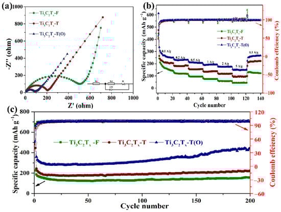 (a) Nyquist plots; (b) rate performance at different current densities; (c) cycling performance at 0.1 A g−1 for different anodes of Ti3C2Tx-F, Ti3C2Tx-T and Ti3C2Tx-T(O).