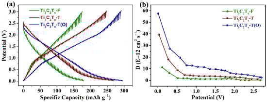 (a) GITT results and (b) diffusion coefficient for Ti3C2Tx-F, Ti3C2Tx-T, and Ti3C2Tx-T(O) anodes at different potentials.