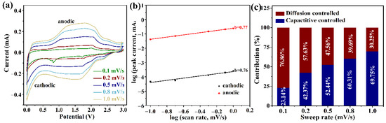 By studying the CV curves of the Ti3C2Tx-T(O) anode at different scanning speeds, the kinetics of lithium storage was explored and the contribution ratio of capacitance was calculated. Figure 8a shows the CV curves of the Ti3C2Tx-T(O) anode at different scan rates. According to the cyclic voltammetry test formula i = avb, it was logarithmically transformed to obtain log(i) = blog(v) + log(a). The b value of the redox peak of the electrode was calculated by plotting the log(i)-log(v) curve. When b = 0.5, it indicated that the electrode reaction was dominated by diffusion, and when b = 1, it indicated that the electrode reaction was dominated by surface pseudocapacitance as host []. As shown in Figure 8b, the b values of the oxidation peak (~1.5 V) and reduction peak (~1.7 V) of the Ti3C2Tx-T(O) anode were calculated to be 0.76 and 0.77, respectively. The total capacity of the electrode was divided into two parts: (1) the capacity contribution provided by the ion-diffusion process; (2) the pseudocapacitive contribution provided by the redox reaction that occurs during the charge-transfer process on the electrode surface. The lithium storage form of the Ti3C2Tx-T(O) anode was quantified, as shown in Figure 8c. At the scan rate of 0.1 mV s−1, the capacitive contribution of the negative electrode of Ti3C2Tx-T(O) accounted for 23.14%, and when the scan rate increased to 1.0 mV s−1, the capacitive contribution increased to 69.75%. With the increase, the diffusion rate of Li+ at the electrode interface was accelerated, and the pseudocapacitance contribution increased.