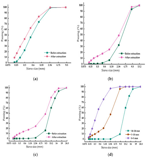 RAP and RAI materials used in this paper were sieved into three different fractions: fine RAP 0/5 (0–5 mm), medium RAP 5/10 (5–10 mm), and coarse RAP 10/20 (10–20 mm). The three RAP fraction gradations before and after extraction are presented in Figure 1a–c, and the three RAI fraction gradations are presented in Figure 1d.