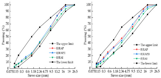 To fulfill the aims of the experiment, six distinct CRMs were designed as follows: emulsified asphalt CRM with RAP (labeled E/RAP), emulsified asphalt CRM with composite RAP and RAI (labeled E/RAP/I), emulsified asphalt CRM with RAI (labeled E/RAI), foamed asphalt CRM with RAP (labeled F/RAP), foamed asphalt CRM with composite RAP and RAI (labeled F/RAP/I), foamed asphalt CRM with RAI (labeled F/RAI). This selection facilitates a comparison between the mixtures concerning the asphalt type and recycled material type and their effect on the mixture performance separately.