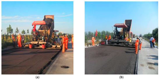 After the mixture design and the volumetric and mechanical properties of different CRMs were defined, the second phase of the research program was to devise a full–scale trial field. The designed pavement structure for the trial section was constructed in a typical maintenance work manner and subjected to heavy traffic in Shandong. The maintenance work had two lanes in one direction, and the cold recycling test section was performed in both directions; each CRM test section was about 500 m in length and 7.5 m in width. The original pavement structure comprised 10 cm HAM layers, 16 cm cement stabilized gravel base course, and 32 cm cement stabilized weathered sand (two layers).