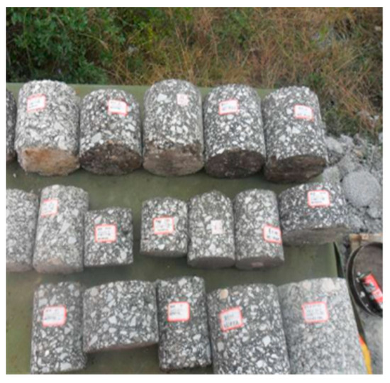 During the maintenance work, the HMA layers and the cement stabilized gravel base course were removed by a milling operation and transported back to the recycling plant. The new CRM structure was a 12 cm HMA layer (two layers) and a 15 cm CRM layer (different types). After finishing the CRM upper base course, the 12 cm HMA layers were constructed as wearing courses. Samples were collected from the test section for laboratory testing before paving the HMA layers. The samples of foamed CRM structures were cored from the test section using coring machines after two days of curing. The samples of emulsified CRM structures were cored after five days of curing. The construction operation of CRM structures is shown in Figure 3. Samples of different CRM structures are shown in Figure 4. The samples were treated and tested in the laboratory.