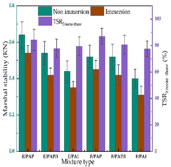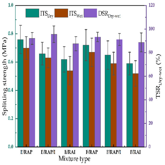 In this paper, the freeze–thaw ITS test was used to evaluate the water stability of the CRMs. The final splitting strength and freeze–thaw splitting strength ratio (TSRFreeze–thaw) are shown in Figure 6.
