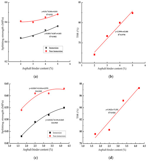 Freeze−thaw ITS test results of E/RAP and F/RAP. (a) Splitting strength of E/RAP with various asphalt binder contents. (b) TSRFreeze–thaw of E/RAP with various asphalt binder contents. (c) Splitting strength of F/RAP with various asphalt binder contents. (d) TSRFreeze–thaw of F/RAP with various asphalt binder contents.