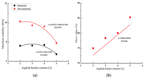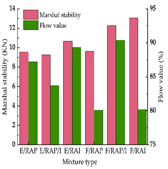 The water immersion Marshall stability test was also used to determine the optimum asphalt binder content in this study. The Marshall stability and flow value of E/RAP and F/RAP are depicted in Figure 9.