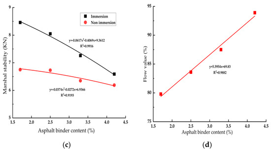 There is no accepted standard or specification for determining the optimum asphalt content. However, the optimum asphalt content should be the value when the CRM has the highest stability, the highest dry density, the most suitable air voids, and the aggregates skeleton within the regulation limits [74]. In the USA, different mixture design methods adopt varied asphalt binder contents based on the Marshall stability and flow values at 60 °C. In China’s recycling specification (JTG/T 5521 2019) [57], the asphalt binder content is determined by using the ITS test at 15 °C or water immersion Marshall stability and void as control indexes. The ITS test could evaluate the cracking resistance of CRM, and for the water stability of CRM, the representation of the ITS test is very low. As a result, in this paper, we chose the ITSFreeze–thaw values and TSRFreeze–thaw to determine the asphalt binder. Under a fixed water content and varied asphalt contents, the optimum asphalt content is the asphalt binder content that referred to the maximum ITSFreeze–thaw values and TSRFreeze–thaw.