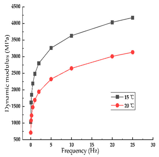 The dynamic modulus test was performed to measure the dynamic modulus of CRM. The dynamic modulus of F/RAP at 15 °C and 20 °C is shown in Figure 11.