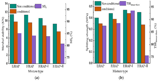 The freeze–thaw splitting test was also used to determine the optimum asphalt binder content in this study; the splitting strength and freeze–thaw splitting strength ratio (TSRfreeze–thaw) of E/RAP and F/RAP are depicted in Figure 7.