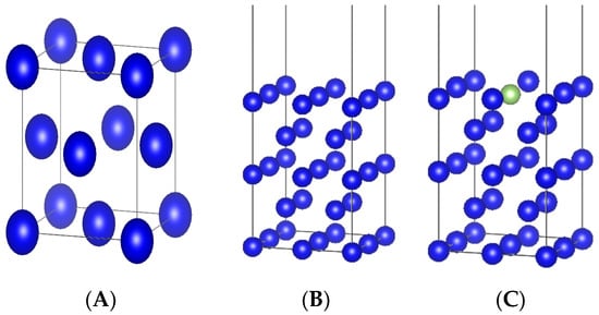 (A) Single-cell structure. (B) Surface model. (C) Plutonium–gallium system model. δ-Pu single-cell structure, δ-Pu(100) surface model, and plutonium–gallium system model.