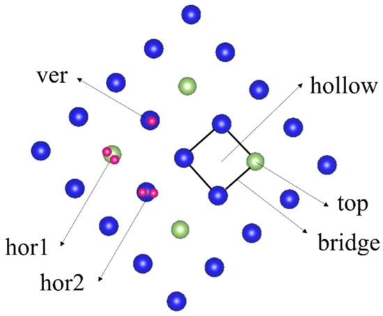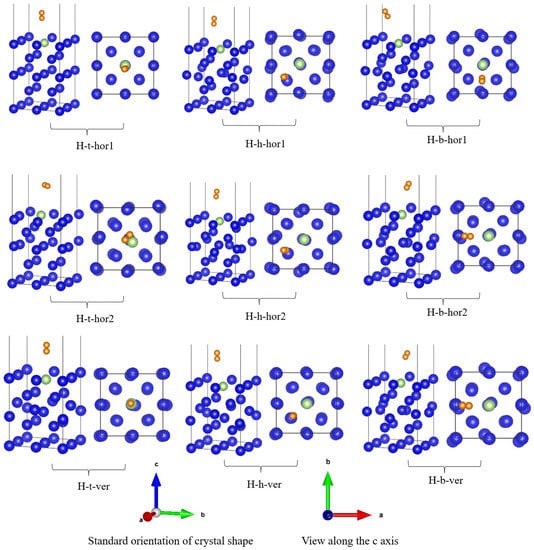 In the construction of the adsorption model, a hydrogen molecule was placed on the surface of an optimized plutonium–gallium system containing 19 plutonium atoms and 1 gallium atom with a coverage of 0.25. The bond length of H-H in H2 was 0.7372 Å. The adsorption molecules were placed on the bridge, hollow, and top positions of the plutonium–gallium system. The molecules in each adsorption position were considered three adsorption directions: adsorption molecules are perpendicular to the surface (ver); adsorption molecules are parallel to the surface and parallel to the crystal axis (with hor1); adsorption molecules are parallel to the surface and parallel to the diagonal of the crystal axis (with hor2). There were nine initial adsorption configurations of H2 on the surface of the plutonium–gallium system, as shown in Figure 2. For example, H-h-ver in H represents the adsorption of hydrogen molecules, h indicates that the initial adsorption position is centroidal (hollow), and ver indicates that the gas molecules are placed perpendicular to the surface.