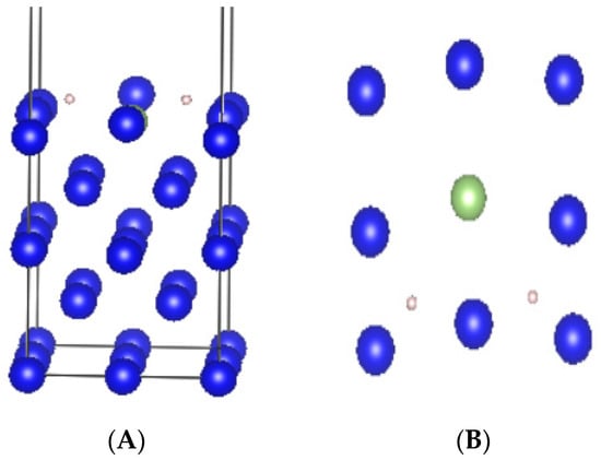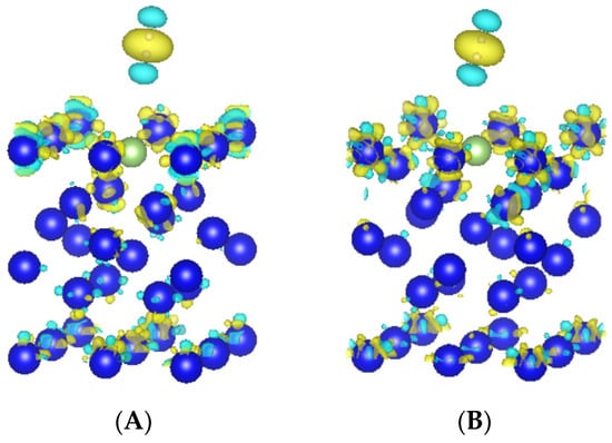 Through the calculation, we obtained the differential charge density diagrams of two adsorption configurations, as shown in Figure 4. From the diagrams, we can see that the two stable adsorption configurations have less charge density on one side of the hydrogen molecule near the surface and more charge density on the other side, and the charge density of atoms on the surface of the plutonium–gallium system changes mainly in the first layer of atoms on the surface, which is consistent with the conclusion of the calculated Bader charge transfer amount. In general, the hydrogen adsorption distance on the surface of the plutonium–gallium system is large, the degree of interaction is small, and there is no obvious bonding effect.