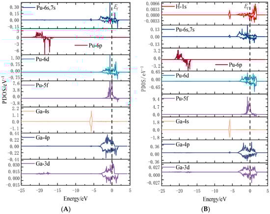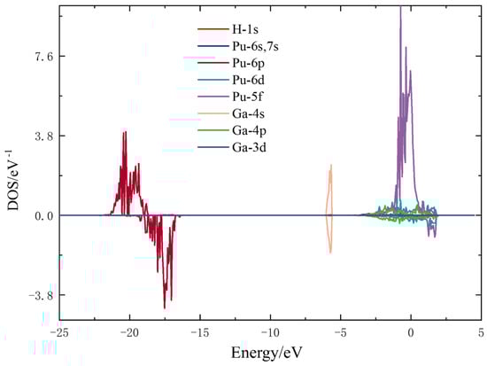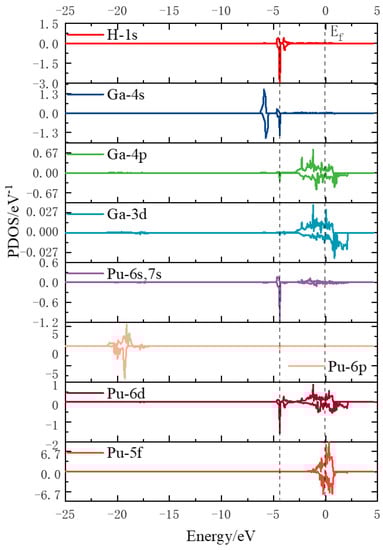 To further investigate the microscopic interactions between hydrogen atoms and surface atoms of the plutonium–gallium system, the most stable configuration for hydrogen adsorption (H-h-hor1) was selected, and its density of states was calculated and analyzed. The split-wave density of states is shown in Figure 5, where a hydrogen atom and the nearest plutonium and gallium atoms are selected.