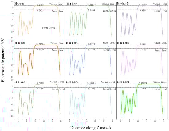 We analyzed the changes in the surface work function of the pure Pu–Ga system and the surface work function before and after the adsorption of hydrogen molecules, and the calculated results are shown in Table 3. The work functions of each configuration are shown in Figure 7. There is no experimental data available regarding the surface function of Pu, and the work function of its neighboring element uranium is in the range of 3.63 eV–3.90 eV [20]. Wei Hongyuan et al. [21] calculated the work function for the bare surface of δ-Pu(100) as 4.365 eV, and Atta-Fynn et al. [4] calculated the work function of the δ-Pu(111) slab as 3.39 eV. The surface work function of the Pu–Ga system calculated in this paper is 2.9895 eV based on the substitution of the δ-Pu surface doped with certain Ga atoms, and the obtained surface work function is 2.9895 eV. Considering the different calculation methods and calculation models, the above work function calculation differences are reasonable. After the adsorption of hydrogen molecules, the surface function changed to a certain extent. The adsorption of a more stable hole–site adsorption surface function increased to a certain extent, while the surface function of other adsorption configurations decreased, but the changes were small, all within 0.1 eV. The reason for the change is due to the charge transfer between hydrogen molecules and the surface of the plutonium–gallium system; electrons are transferred from the surface of the plutonium–gallium system to hydrogen molecules, thus forming a surface dipole moment from the surface to hydrogen molecules, which is the fundamental reason for the change of surface function. The small amount of electron transfer from hydrogen molecules to the surface leads to a small change in the surface function.