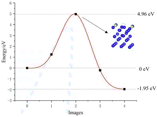 As can be seen from the above analysis, the adsorption of hydrogen on the plutonium–gallium system is physical adsorption; the H–H bond of the hydrogen molecule is not broken, and no new chemical bond is formed with the surface. In practice, hydrogen can cause hydrogen etching on the surface, the essence of which is the dissociation of hydrogen molecules into hydrogen atoms to form chemisorption with the surface; therefore, it is important to study the dissociation of hydrogen on the plutonium–gallium system. Based on the transition state search [22,23] algorithm performed, the transition state and dissociation potential were finally obtained.