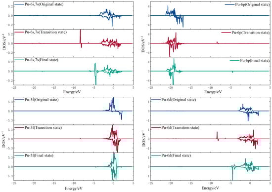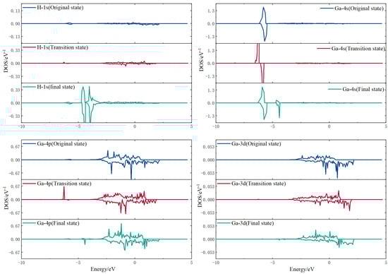To further study the dissociation process of hydrogen molecules on the surface, the density of states of the initial, transition, and final states were calculated by selecting a hydrogen atom and the nearest plutonium and gallium atoms, respectively. The comparative diagrams of the density of states for the three states are shown in Figure 10 and Figure 11.