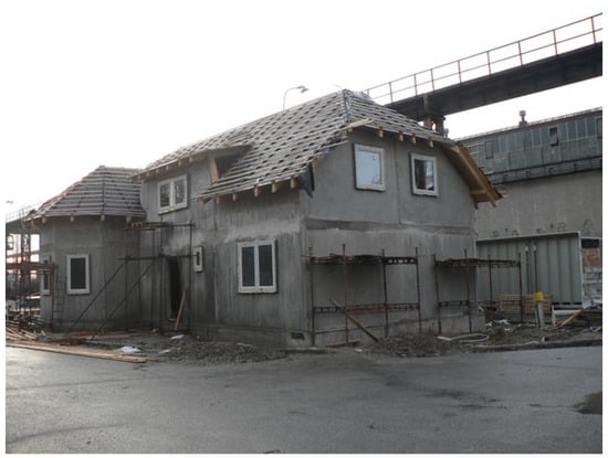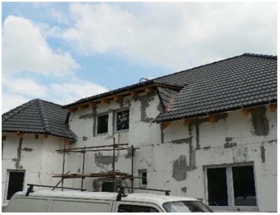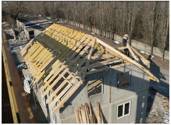 From a structural point of view, a prefabricated longitudinal load-bearing system was applied, with load-bearing peripheral walls and one central wall formed by reinforced concrete panels (Figure 28). The roof is gable with a ridge parallel to the front façade (Figure 29). The ground floor contains an entrance hall with a staircase, offices, and sanitary facilities. The attic contains a corridor, offices, and sanitary facilities.