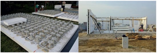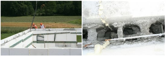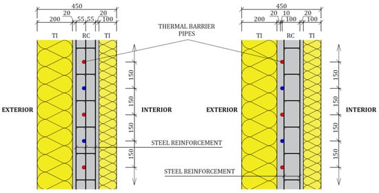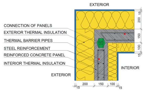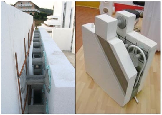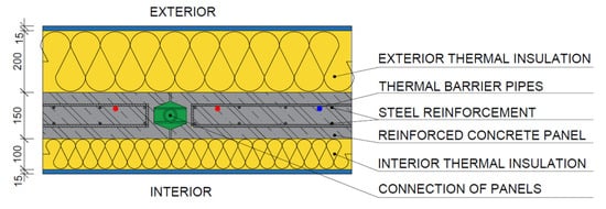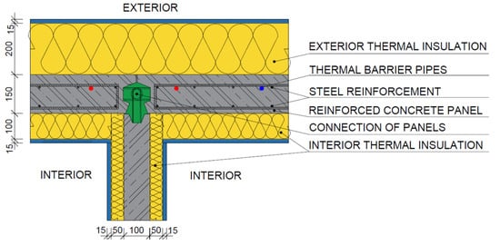 Building envelope panels, according to the ISOMAX system [], consist of a lost formwork on the interior and exterior side—slabs of expanded polystyrene with a thickness of 75 mm and a load-bearing static reinforced concrete part with a thickness of 150 mm, in which PP-20/2 tubes are embedded at an axial distance of 100 to 250 mm from each other, forming the circuits of the thermal barrier (Figure 3). The wall constructed in this way functions not only as a thermal barrier, but also accumulates heat and cold in the mass of the load-bearing part where a large-capacity reservoir is formed.
