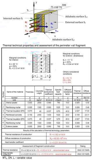 - Analysis of the composition of the innovative envelope panel solution and development of the mathematical–physical model, (Section 3.3);