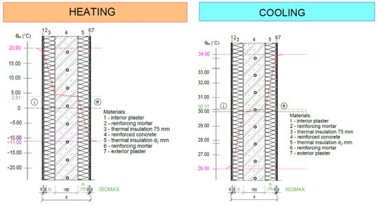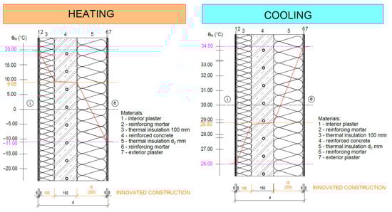 In our research, in addition to troubleshooting the ISOMAX panels for on-site implementation, we also focused on the energy analysis of the thermal barrier function and the heat/cold accumulation potential in the mass of the load-bearing reinforced concrete wall. For the purpose of the parametric study, a mathematical–physical model of the wall ISOMAX was created (Figure 4). The basic physical properties of the building materials comprising the ISOMAX panel—thickness, bulk density, thermal conductivity coefficient, specific heat capacity, and diffusion resistance factor—are tabulated in the mathematical–physical models included in Figure 4.