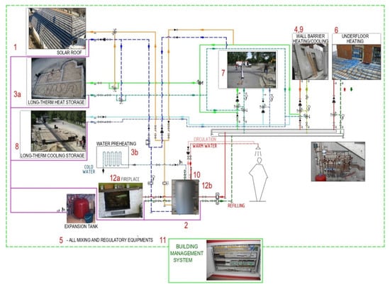 Simplified wiring diagram of the technical solution of the energy systems of the IDA I prefabricated house prototype []. 1—solar absorber (energy/solar roof), 2—short-term heat storage, 3a—long-term heat storage, 3b—long-term heat storage, 4—active thermal protection circuits (building structure with an internal heat source), 5—mixing and control equipment, 6—low-temperature heating circuits, 7—heat recovery ventilation equipment, 8—cooling circuits located in the ground outside the building, 9—high-temperature cooling circuits, 10—waste heat from the drainage system, 11—building control system, 12a—fireplace, 12b—peak heat source. The red and green arrows in the figure represent the direction of flow of the heat transfer fluid.