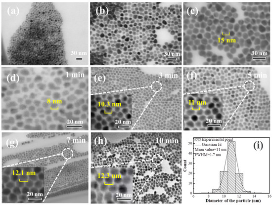 Considering to the previous reported method, the particle sizes of mid-infrared HgTe CQDs should be controlled at about 7–12 nm [10], and the injection temperature is determined at 120 °C. For the preparation of the precursor, we dissolve HgI2 in oleylamine, degassed at room temperature for 20 min, and then it is heated to 100 °C for 1 h to remove soluble impurities such as water and CO2. The change of the quantum dots’ particle size is observed by increasing the injection temperature which is set at 120, 130, and 140 °C, respectively. It is found that the size distribution of quantum dots changed significantly at different injection temperatures, and we initially speculated that the reaction process is hindered by the strong binding energy of Hg–I at lower temperatures. With the increasing temperature, the influence of the size distribution by Hg–I binding energy gradually weakened. Figure 1a–c shows the distribution of HgTe CQDs at different injection temperatures, and the size distribution of quantum dots gradually decreases with the increase of injection temperature. We conclude that Hg–I can be destroyed at 140 °C to form stable Hg precursors solution. However, the size of the synthesized quantum dots gradually increased, and the particle size could reach 15 nm at the injection temperature of 140 °C. As shown in Figure 1c, the particle size could not be controlled within the range of 7–12 nm. Therefore, we propose a way to increase the preparation temperature of the precursor solution and reduce the injection temperature. We increase the preparation temperature of the precursor solution from the original 100 to 140 °C, and then reduce the injection temperature to 120 °C under N2 atmosphere. HgTe CQDs of different sizes are obtained by controlling different growth temperatures and growth time. Figure 1d–h shows the TEM images of the morphology of quantum dots changing with the growth time at 120 °C and the growth temperature at 120 °C. Figure 1i is a histogram of diameters for 100 quantum dots with a growth time of 7 min.