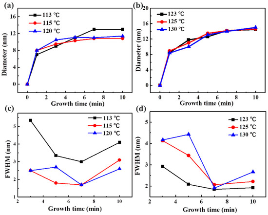When the injection temperature is 120 °C (a) and 130 °C (b), the relationship between particle size and growth time at different growth temperatures; when the injection temperature is 120 °C (c) and 130 °C (d), the relationship between FWHM and growth time at different growth temperatures.
