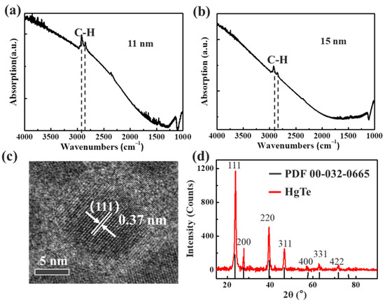 Absorption spectra of 11 nm (a), 15 nm (b) HgTe CQDs; (c) HRTEM image of HgTe CQDs; (d) XRD spectrum with labeled bulk HgTe diffraction angles.