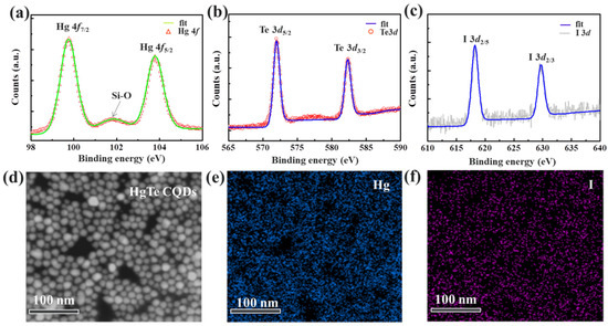 In order to observe the coating effect of I− on the surface of HgTe CQDs more intuitively, the results of EDX spectrum are shown in Figure 4d–f. The distribution of each colloidal quantum dot can be seen from the electronic image, as shown in Figure 4d. The brighter area is the area in which HgTe CQDs are distributed, and the darker area is the copper grids and the carbon grids area attached to the copper grids with no HgTe CQDs. Among them, Hg and I elements are marked with two different colors of blue and pink, respectively, as shown in Figure 4e,f. Comparing the electron image and the element distribution map, it can be clearly seen by observing the blue marks that the particles in the electron image are indeed composed of Hg elements, and the distributions of these two elements are the same as that in the electron image. The particle distribution remains the same. For the I element marked in pink, it can be seen that the distribution follows the distribution of HgTe CQDs, confirming the conclusion that I− coated on the HgTe CQDs surface. Figure S4 shows the EDX surface total spectrum.