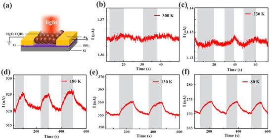 (a) Schematic diagram of the structure of the HgTe CQDs photoconductive device; I–t diagrams of the devices at 300 K (b), 230 K (c), 180 K (d), 130 K (e), and 80 K (f) under 2000 nm illumination, respectively.