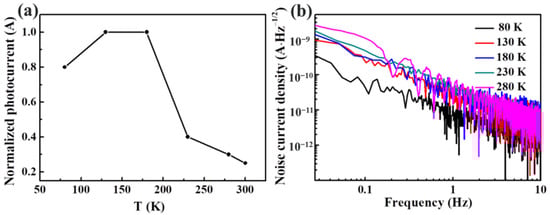 (a) The relationship between photocurrent and temperature of the device at 2000 nm; (b) spectra of noise current density with different operating temperature.