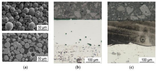 SE images of a feedstock material, as well as optical microscope images of the diamond smoothed HS-LMD coating systems in cross-sectional view after etching. (a) CrFeCoNi powder, (b) CrFeCoNi coating, (c) AlCrFeCoNi coating.