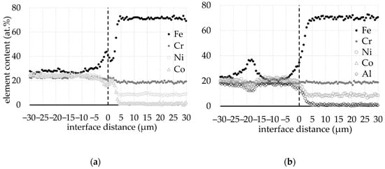The results of the EDS linescan measurements in the interface between the substrate and the coating materials in Figure 2 could confirm this. For both alloys, the gradient region was less than 10 µm. In the case of the AlCrFeCoNi coating, a reincrease in the Fe concentration was observed for an interface distance of approximately 20 µm. This can be attributed to the depositions of substrate at the interface in the trace overlap region. With a further increase in interfacial distance, no elemental variations were observed in either coating system.