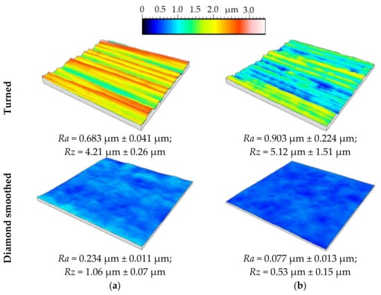 A comparison of the two coating processes shows that the constitution of the coating had a stronger influence on the results of the turning process than did the chemical composition. Subsequent diamond smoothing of the LMD coatings significantly reduced the surface roughness values by deforming the peaks and lifting the valleys of the turned surface profile. However, the mean values for Ra were three-fold, and for Rz, two-fold higher after smoothing the CrFeCoNi HEA, compared to the other coating. The 3D LSM images show that the smoothing force was too high in the case of CrFeCoNi. Hence, there was a deformation of the profile peaks after turning, as well as the appearance of a kind of kinematic surface profile, due to diamond smoothing. Reducing the smoothing force can provide roughness values that are similar to those of the AlCrFeCoNi coating system. Compared to alternative mechanical processing methods such as grinding, electrical discharge machining, or milling on selective laser-melted CoCrFeMnNi parts, significantly lower surface roughness values are possible with diamond smoothing [].