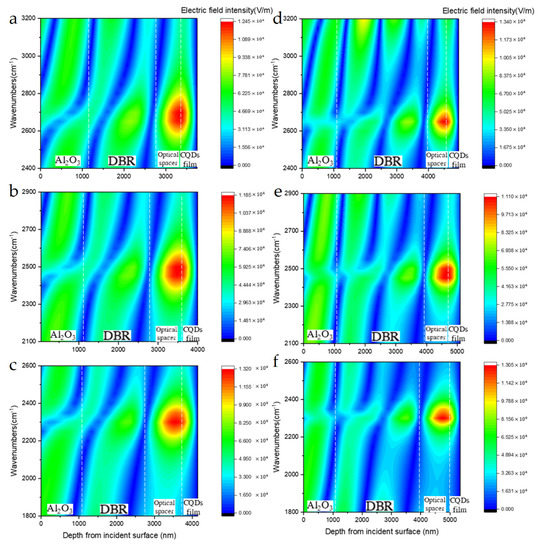 Figure 2. Optical field distributions of the resonant cavity. Optical field distributions for optical spacer layer thicknesses of (a) 0.6, (b) 0.8, and (c) 1.0 µm of one layer of DBR are shown. (df). The optical field distributions for two layers of DBR with the same optical spacer layer thickness as one layer. Different layer positions are marked by white dashed lines.