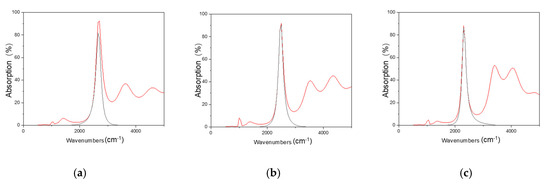 Figure 3. Spectral absorption of photodetectors with resonant cavities constructed from narrowband (HgSe, black line) and broadband (red line) optoelectronic materials at optical spacer layer thicknesses of 0.6 (a), 0.8 (b), and 1.0 (c) µm.