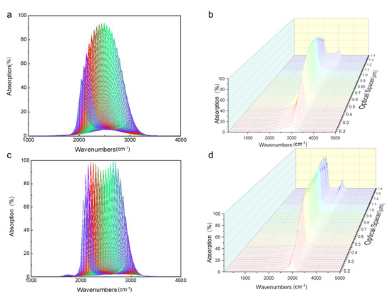 Figure 4. Absorption of the CQD microspectrometer. (a,b) Absorption of a CQD microspectrometer with different optical spacer thicknesses with one layer of DBR. (c,d) Absorption of a CQD microspectrometer with different optical spacer thicknesses and two layers of DBR.