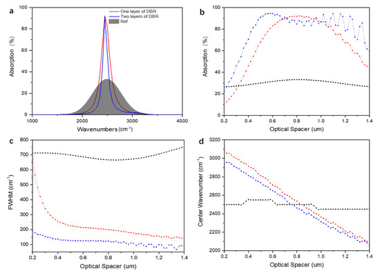 Figure 5. Effect of resonant cavity composed of DBR on CQD detector. (a) Absorption of the CQD detector with one layer of DBR, two layers of DBR, and no DBR (Ref) for the thickness of the optical spacer layer is 0.82 µm. Absorption (b), FWHW (c), and center wavenumber (d) of absorption peak of the CQD detector at different thicknesses of the optical spacer layer with one layer (red line), two layers (blue line) of DBR, and no DBR (black line).