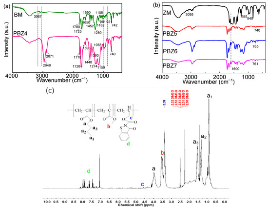 The structure of the copolymers (for example polymer PBZ4) was confirmed by FT-IR spectrometer (Figure 1a). The absorption peak at 3087 cm−1, attributed to Csp2-H stretching vibration of the monomer BM, disappeared in PBZ4, and the characteristic absorption peaks at 1650, 1590, and 1452 cm−1, attributed to the aromatic ring existing in the BM, appeared in PBZ4, indicating that the BM monomer had completely polymerized with MMA and BA. Meanwhile, the characteristic FT-IR peaks at 981 and 921 cm−1, attributed to the deformation vibration of Csp2-H in BM, disappeared in PBZ4, and the characteristic peak at 740 cm−1, a result of the aromatic ring Csp2-H bending vibration in BM, also appeared in PBZ4, demonstrating that the monomer BM was integrated into the polymer.