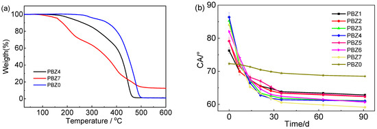 Figure 2b illustrates the change of the contact angle by immersing the resins in seawater. The initial contact angle of resins PBZ1-7 was greater than that of the control sample PBZ0, and the addition of monomer BM and ZM increased the hydrophobicity, while increasing the amount of monomer meant that contact angle values were increased. The contact angle of resins PBZ1-7 decreased remarkably after immersion in seawater. However, the value of PBZ0 decreased slowly. Due to the fact that the hydrolysis of BM and ZM produced hydroxyl and carboxyl groups, the polymer’s surface was covered by a hydrophilic layer and the contact angle decreased, while the hydrophobicity increased. After 30 days, the hydrolysis rate of terminal group became stable and the value of contact angle became steady.