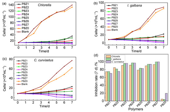 Inhibition of PBZs on Chlorella (a), I. galbana (b), and C. curvisetus (c). Inhibition rate of copolymer PBZs against the growth of algae (d).