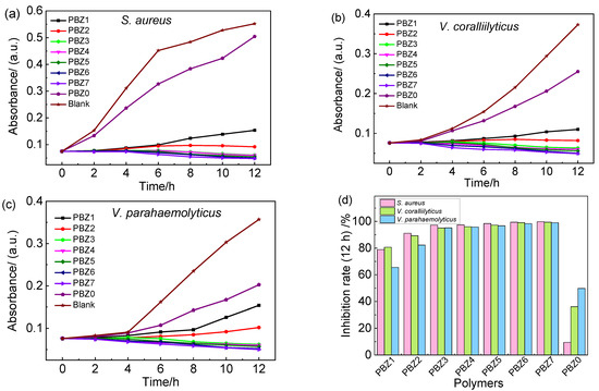 The inhibitory properties of the copolymer PBZs on the growth of three marine bacteria (S. aureus, V. coralliilyticus, and V. parahaemolyticus) are shown in Figure 4.