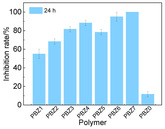 Figure 4 depicts the bacteriostasis of copolymers PBZ1-7, with the inhibition rate closely related to the content of the BM monomer. The bacteriostatic action increased proportionally as the concentration increased from 5% to 20%. The inhibition rate of PBZ4 on S. aureus, V. coralliilyticus, and V. parahaemolyticus reached 97.43%, 95.09%, and 95.81%, respectively. However, the inhibition of PBZ0 in the absence of monomer BM was lower than the grafted resins and the absorbance increased considerably after 2 h. The inhibition of acrylic polymers enhanced continuously when the polymerized bifunctional monomer ZM was added to the polymeric compound. The antibacterial rates of polymers PBZ7 with 20% ZM against the above three marine fungi increased to 99.80%, 99.39%, and 99.03%, respectively, which almost suppressed the fungi reproduction completely. The absorbance declined slowly after 2 h.