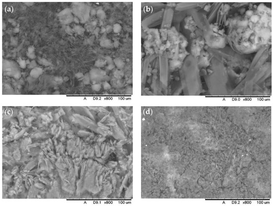 However, with increased molarity, higher CA was achieved in a shorter immersion time. This is demonstrated by formulations 7 and 8. Formulation 8 returned the greatest CA of 146°, in an immersion time of 120 min. Reducing the immersion time required to produce the coated surface is a crucial factor in improving the coating’s industrial viability. Figure 6d shows the surface morphology of this sample, zinc stearate is formed in needle-like structures encapsulating floccules of SiO2. The smaller needle structures are distributed more evenly across the surface, thereby, achieving better coating surface homogeneity. This enables air to be retained between zinc stearate and SiO2 molecules. In turn, this contributes to a rougher surface that stops water droplets from permeating between pores, increasing the CA measured and surface hydrophobicity [13,35].