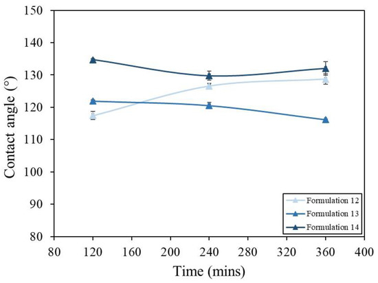Relationship between CA against immersion time for formulations 12–14 from Table 1.