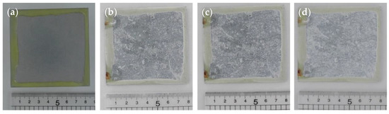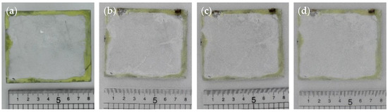 The investigation was conducted for up to 1000 h. At intervals of 0, 250, 500 and 1000 h a canon EOS 5D camera within a lightbox was used to photograph the samples, mass measurements were taken of each sample. Epoxy resin was used to seal the cut edges of the samples, and the water uptake of the resin was negated for and deducted from the final mass change values to achieve accurate and concurrent readings. Figure 11a–d and Figure 12a–d show photographs taken of the uncoated and coated samples throughout humidity testing.