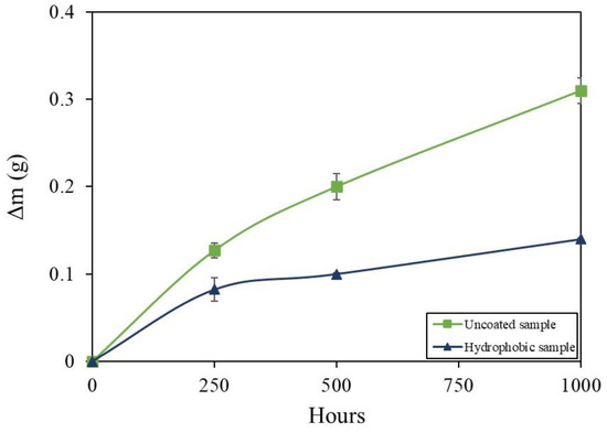 Mass gain of humidity samples over 1000 h displaying uncoated sample and hydrophobic sample.
