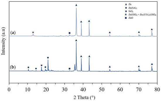 Compositional analysis from XRD is given in Figure 14, which is used to determine the phase structure of the hydrophobic coating. A comparison is shown between the uncoated sample and the hydrophobic sample after 1000 h of humidity testing. By comparison, we observed that zinc stearate (Zn(SA)2 where SA represents the stearate complex) is formed on the hydrophobic sample surface, and this signifies the reaction of zinc and stearic acid as shown in Equation (1). SiO2 can also be seen in the XRD pattern, showcasing that SiO2 has been encapsulated within the coating by physical action and not changing physical composition. The notable peak, which is observed in the uncoated sample and not the coated sample is that of zinc carbonate hydroxide and zinc hydroxide [6,13,39,40,41]. This is created via the mechanisms: