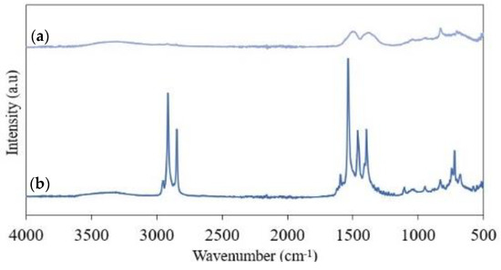 FTIR spectra of humidity samples after 1000 h: (a) uncoated surface and (b) hydrophobic surface.