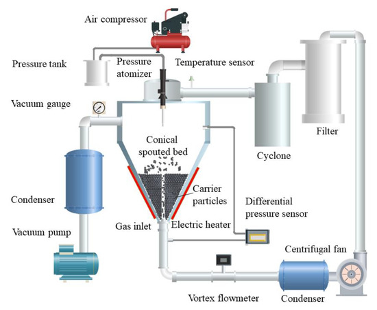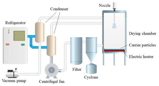 Based on the carrier particle fluidized bed [9], Li et al. invented an integrated carrier particle spouted bed spray freeze-drying device [46], as shown in Figure 3. The materials are frozen on the surface of the spouting cold particles, and low-temperature and low-humidity air is used as the spouting gas. The dry powder layer on the surface of the spouting particles presents a very high porosity. Due to the collision coating between the atomized droplets and cold carrier particles, the droplets freeze rapidly after spreading, avoiding solute segregation migration to instead form interconnected pore networks after the frozen coating dries.